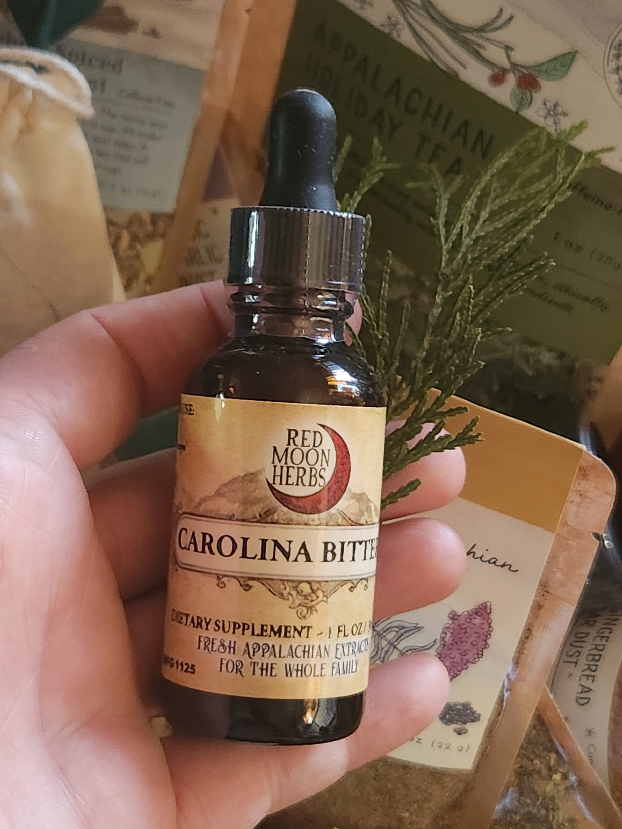 Carolina Bitters blends dandelion (Taraxacum officinale), artichoke (Cynara cardunculus), rosehips (Rosa spp.), reishi (Ganoderma lucidum/tsugae), and gentian (Gentiana lutea), into a digestive support formula.