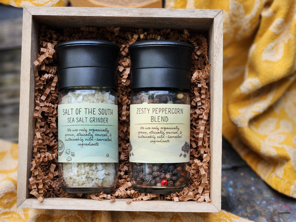 A Sea Salt grinder with a southern flare! We have gathered sea salts from across the South. The trio of salt companies that have come together to create this unique blend are: Celtic Sea Salt (Arden, NC), J. Q. Dickinson Salt-Works (West Virginia), and Sea Love Sea Salt (Wrightsville Beach, NC). Finished with a kiss of hickory smoked salt to bring a little more south to your mouth!