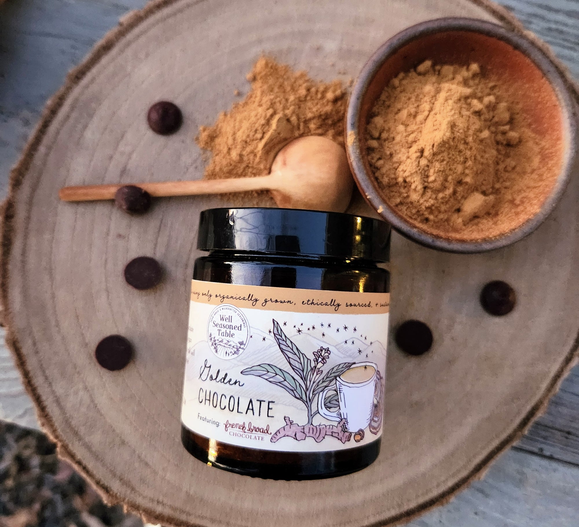 Ingredients: French Broad Chocolate’s roasted cacao, molasses sugar, turmeric, dark chocolate chips (unsweetened chocolate, cane sugar, cocoa butter, soy lecithin, vanilla extract, milkfat), cane sugar, wildcrafted Ganoderma tsugae (Hemlock Reishi), cinnamon, nutmeg, cayenne pepper, black pepper, Celtic Sea Salt®, turkey tail mushroom, ginger.