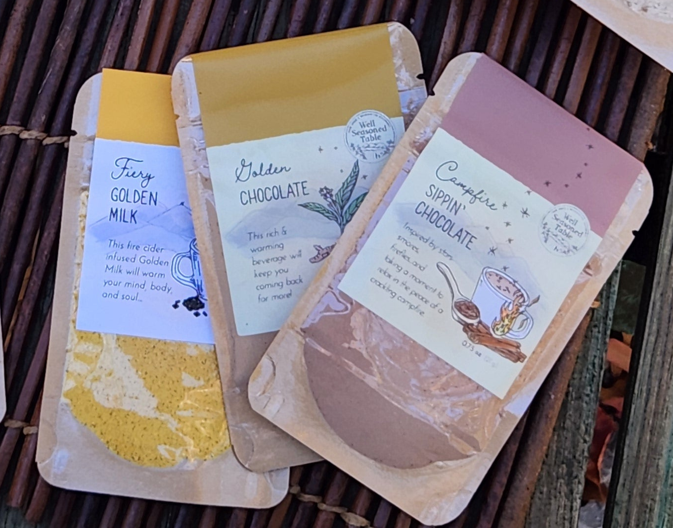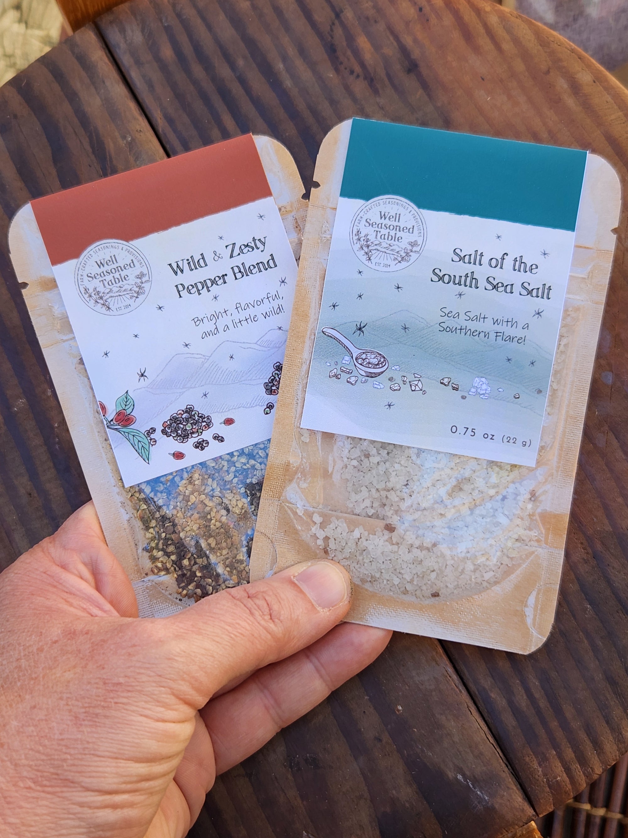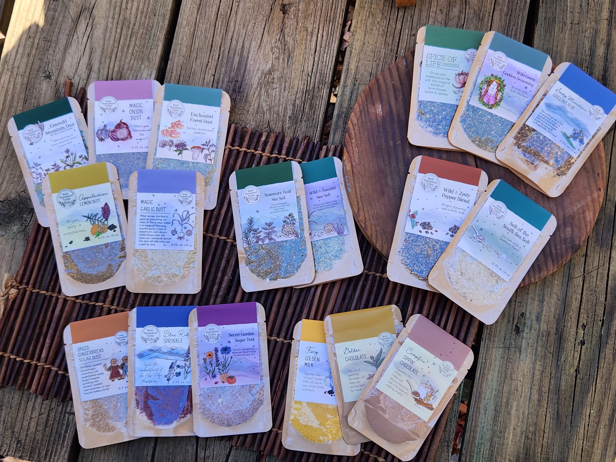 A sample pouch of our year-round and seasonal Farm-house Seasonings, Dusts, Botanically Infused Sea Salts & Sugars, and even a few of our Magical Powdered Beverages!